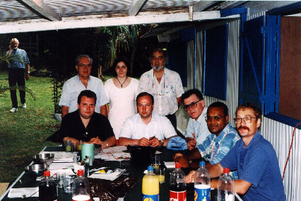 Réunion de travail franco-russe à Sainte Rose dans un cadre tropical, photo souvenir en présence d'un cosmonaute M.SEREBROV et